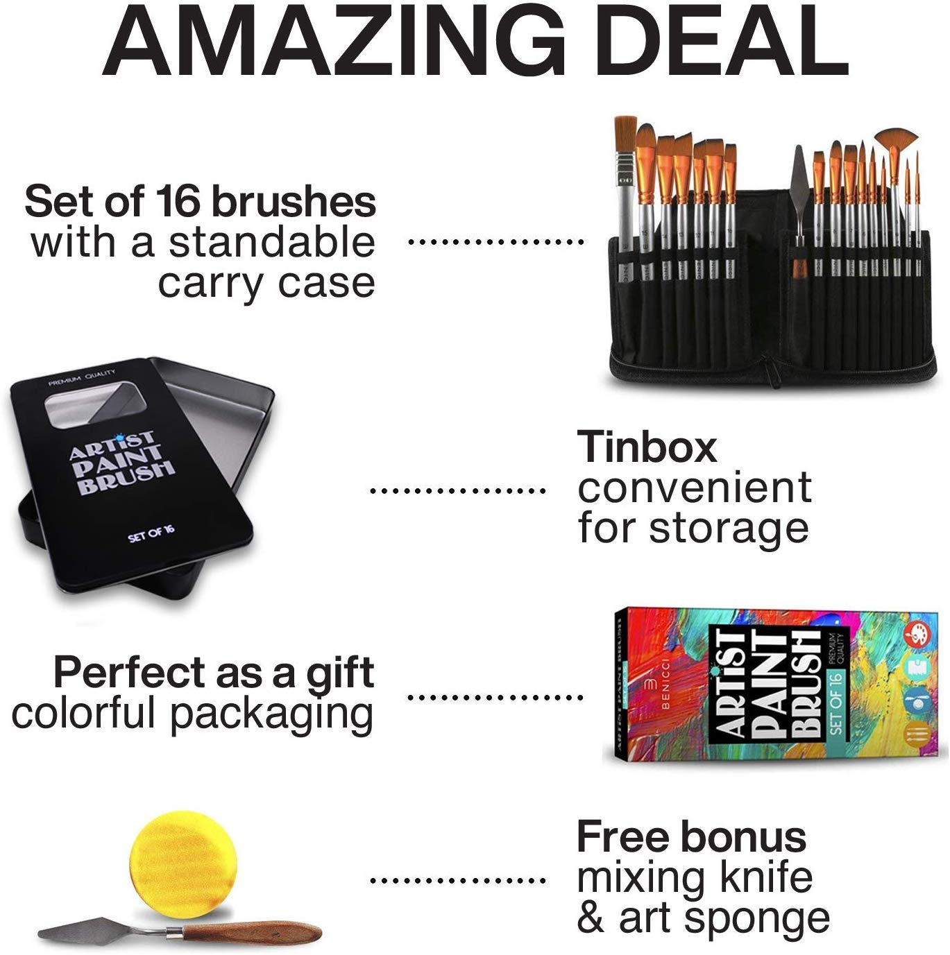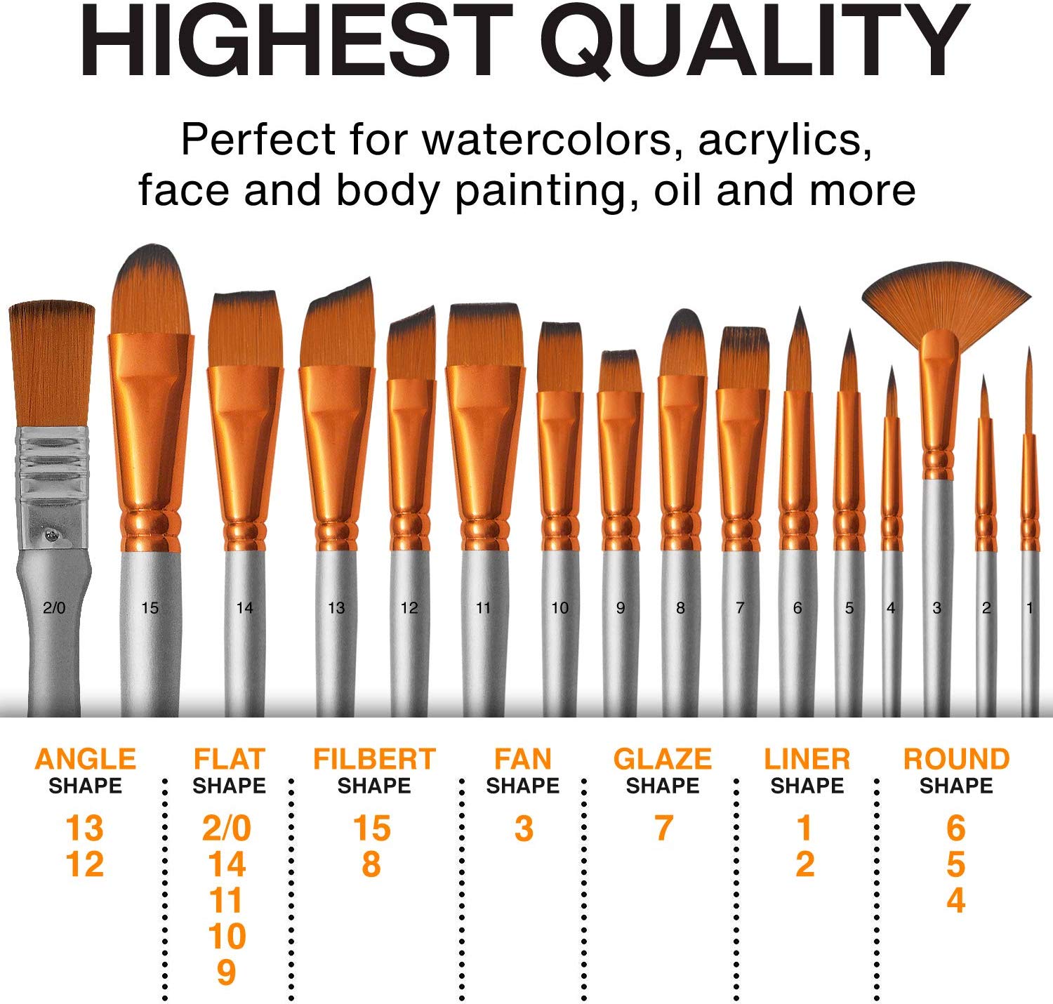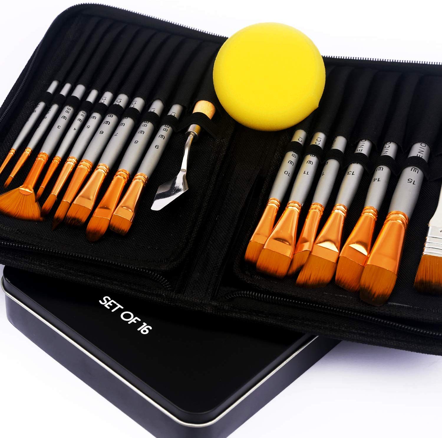 - INSPIRED BY EXPRESSIVE FREEDOM. When you order your paint brush set, you’ll receive 16x nylon brushes – varied shapes and sizes. Suitable art brushes for acrylics, watercolor, gouache, ink, oil, face paint + bonus Mixing Knife and Art Sponge!